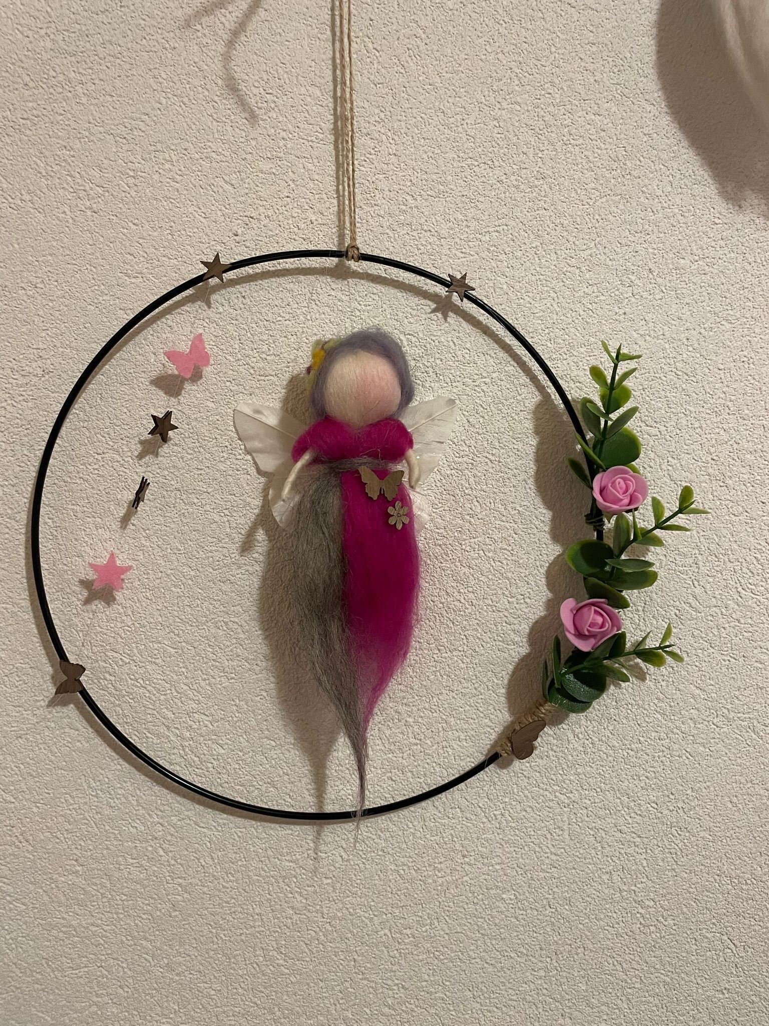 Die Fee, aus weichem Filz gefertigt, schwebt anmutig in einem stabilen Metallrahmen, umgeben von filigranen Verzierungen, die ihr eine besondere Leichtigkeit verleihen. Perfekt als Dekoration für Kinderzimmer, gemütliche Leseecken oder als einzigartiges Geschenk für Feenliebhaber.